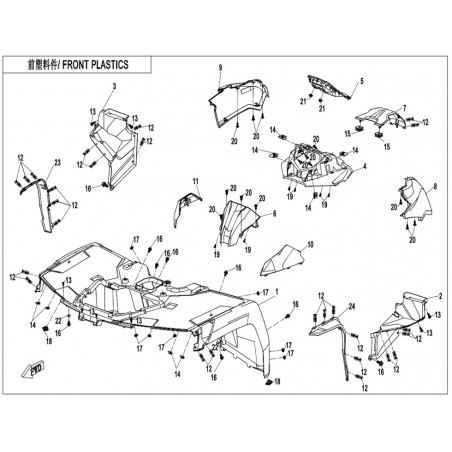 La CARROSSERIE AVANT est un élément essentiel pour assurer la protection et l'intégrité de votre véhicule tout-terrain. Elle joue un rôle crucial dans le bon fonctionnement de votre quad, en offrant une structure robuste qui résiste aux chocs et aux intempéries.