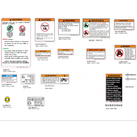 L'AUTOCOLLANT DE SECURITE est un élément essentiel pour garantir la sécurité et le bon fonctionnement de votre véhicule tout-terrain. Il joue un rôle crucial en fournissant des informations importantes sur les précautions à prendre lors de l'utilisation de votre quad, contribuant ainsi à prévenir les accidents et à assurer une conduite en toute sécurité.